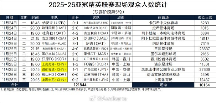 VT直播11月28日讯 亚冠精英联赛第五轮结束争夺,上座人数方面,蓉城主场近2.8万人居首,海港、申花主场超1万人。 亚冠精英联赛第五轮,蓉城1-1战平广岛三箭,本场比赛现场观众27836人,本轮亚冠最多,利雅得新月主场23637人第二,吉达国民主场18117人第三。 申花主场0-2不敌神户胜利船,本场观众12487人排在第四位,海港主场1-3不敌首尔FC,11501位现场观众排在第五位。