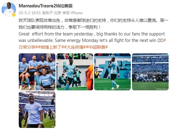 VT直播5月2日讯 今天,大连英博外援马马杜更新社媒,庆祝球队主场击败云南玉昆。 昨天进行的中超第10轮比赛,大连英博主场3-2击败云南玉昆,马马杜首发并且打满全场。此役上座人数达到了60699人,将之前刷新的中超历史第二上座纪录再度提升。 赛后,马马杜在社媒晒照并配文写道:“昨天球队表现非常出色,非常感谢球迷们的支持,你们的支持令人难以置信。周一我们也要保持同样的活力,争取下一场胜利!”