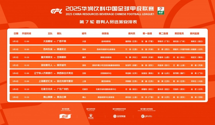 VT直播5月3日讯 中甲官方公布第7轮裁判安排,马腾执法铜梁龙vs定南赣联,李会刚执法辽宁铁人vs陕西联合。 中甲第7轮裁判安排: 5月3日15:00 大连鲲城vs广西平果 主裁判:崔跃强 5月3日19:00 苏州东吴vs南通支云 主裁判:万涛 5月3日19:30 重庆铜梁龙vs定南赣联 主裁判:马腾 5月3日19:30 深圳青年人vs南京城市 主裁判:张浩亨 5月4日15:00 辽宁铁人vs陕西联合 主裁判:李会刚 5月4日19:00 上海嘉定汇龙vs延边龙鼎 主裁判:何晓春 5月4日19:30 石家庄功夫vs广东广州豹 主裁判:任通 5月4日19:30 佛山南狮vs青岛红狮 主裁判:邱兆俊