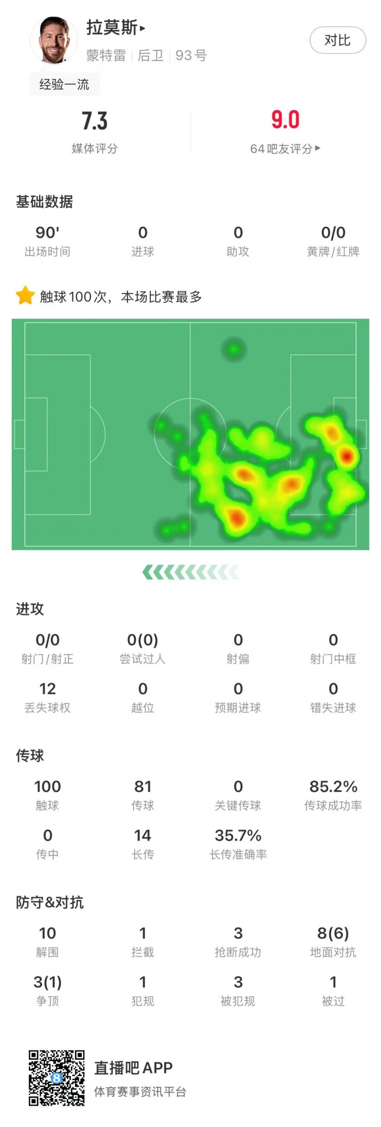 VT直播6月22日讯 世俱杯小组赛E组第2轮,蒙特雷与河床1-1战平,39岁拉莫斯本场比赛为蒙特雷首发踢满全场。赛后媒体为拉莫斯打出评分7.3分。 拉莫斯本场数据统计如下: 评分7.3分 出场时间90分钟 丢失球权12次 触球100次,传球81次,传球成功率85.2% 长传14次,长传准确率35.7% 解围10次,拦截1次 抢断成功3次 地面对抗8次,成功6次 争顶3次,成功1次 犯规1次 被犯规3次 被过1次