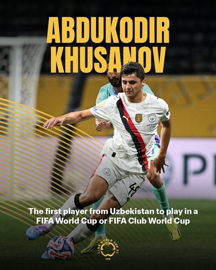 VT直播6月23日讯 在刚刚结束的一场世俱杯比赛中,曼城6-0大胜艾因,胡桑诺夫创造了历史。 FIFA官方晒出海报表示,胡桑诺夫成为历史上首位参加世界杯或世俱杯的乌兹别克斯坦球员。