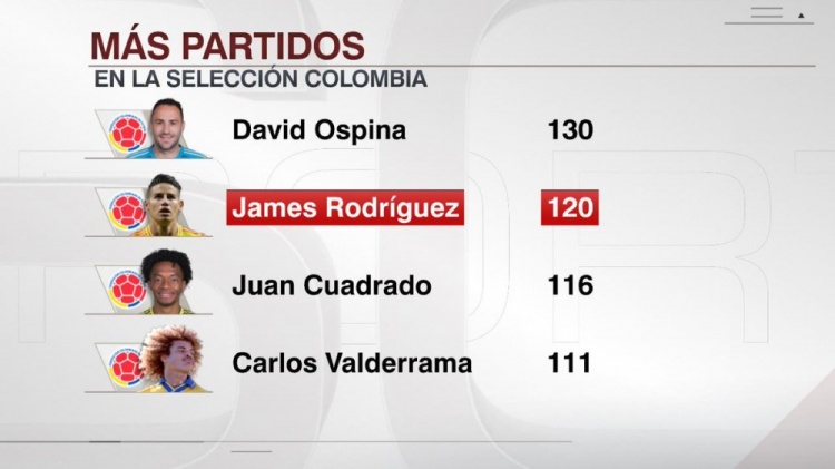 VT直播10月15日讯 北京时间今天上午进行的友谊赛,J罗替补出场,哥伦比亚0-0战平加拿大。 据ESPN统计,此役是J罗为哥伦比亚国家队出战的第120场比赛,队史出场次数仅少于奥斯皮纳。 哥伦比亚队史出场排名: 奥斯皮纳——130 J罗——120 夸德拉多——116 巴尔德拉马——111